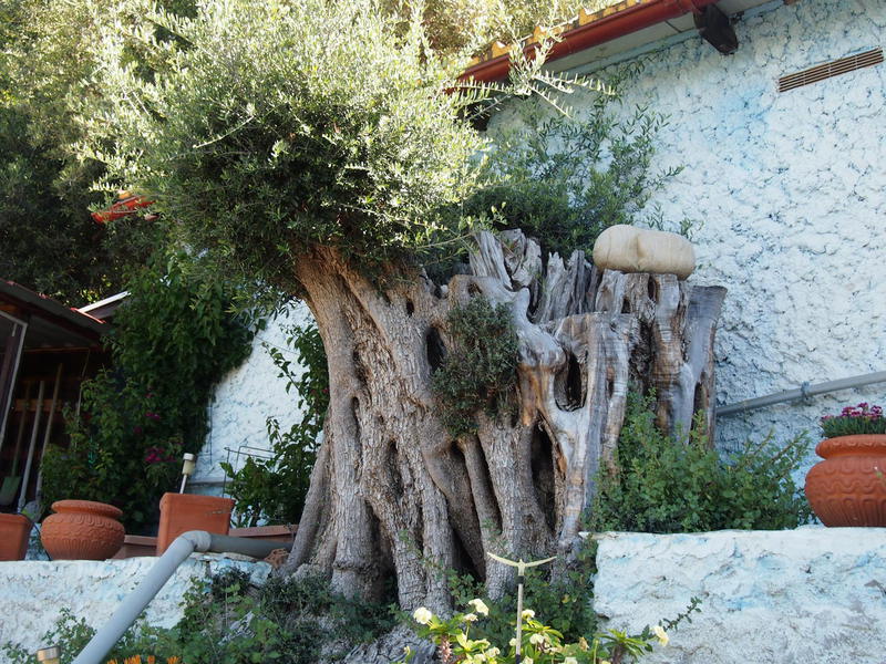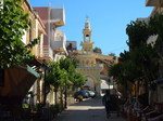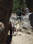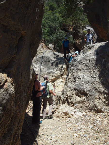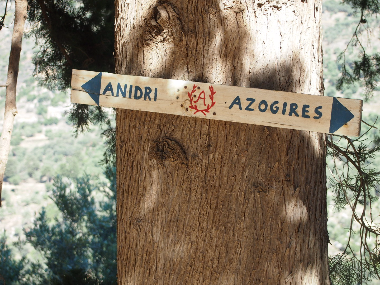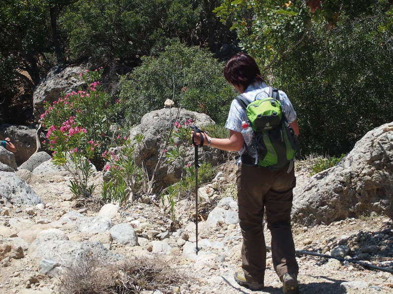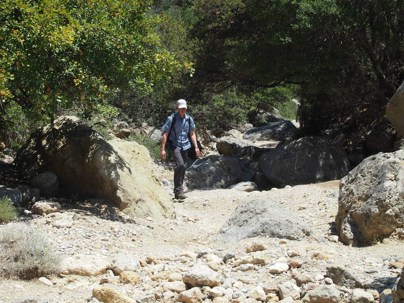 Unsere Tour beginnt bei den ersten Häusern von Azogires. Bis hierher unbedingt mit dem PKW bzw. Taxi hochfahren, da die Autostraße steil nach oben führt und immer in der Sonne ist. Das macht keinen Spaß. In Azogires ist auf der linken Seite eine kleine Taverne. Hier lohnt es sich einen kurzen Blick hinein zu werfen. Die kompletten Wände sind mit alten Materialen behängt. Fast wie im Freilichtmuseum. Am Ortsrand zweigt ein schmaler Pfad nach rechts ab in Richtung Anidri bzw. Kloster. Wir folgen diesem Pfad über alte Steinbrücken nach unten. Nach kurzer Zeit erreichen wir bereits das Kloster "Agioi Pateres". Dieses ist halb in den Felsen eingebaut. Wir gehen gerade aus durch die kleine Klosteranlage hindurch. Überall wachsen die typischen Oliven-, Zypressen- und Pinienbäume bzw. es zeigen sich Ziegen. So stellt man sich Kreta vor. Nach einiger Zeit erreichen wir das kleine Dorf Anidri. Im alten Schulhaus ist heute eine Taverne untergebracht. Die Terasse ist sehr gemütlich und der selbstgepresste Orangensaft schmeckt hervorragend. Nach der Rast folgen wir direkt neben der Taverne dem Schild "Church + Gorges + Beach". Wir kommen nun in die Anidri-Schlucht. Steil geht es teilweise über Felsen im trockenen Bachbett bergab in Richtung Meer. An einer Stelle müssen wir uns an einem Bergseil ein kurzes Stück (3 m) herunterhangeln. So macht Wandern richtig Spaß. Am Ende der Schlucht treffen wir auf den Fernwanderweg E-4. Wir gehen kurz nach links und kommen zum Strand von Gialiskari. Hier gibt es eine gemütliche Taverne und einen kleinen Sandstrand mit Liegen, teilwiese sogar unter Bäumen. Jetzt ist erstmal Pause angesagt. Danach gehen wir links an der Taverne vorbei und folgen dem breiten Küstenweg nach Paleochora. Nach ca. 1 Stunde erreichen wir diesen Ort und unsere Tour ist zu Ende.
