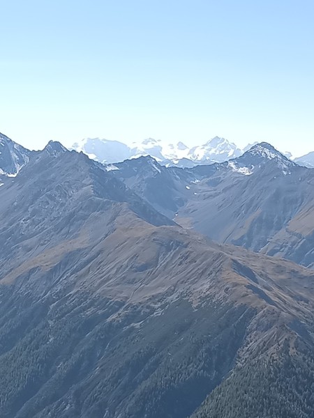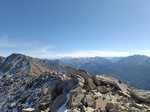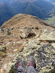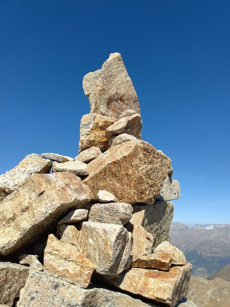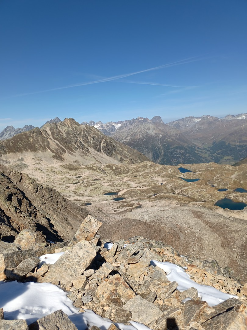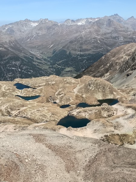 Nachdem wir die Waldgrenze überschritten haben kommen wir zu den Lawinenverbauungen. Serpentinenartig zieht der Weg steil nach oben. Nach den Lawinenverbauungen gelangen wir zum Punkt 2682. Jetzt beginnt der noch steilere Schlussanstieg. Über Blockgestein, teilweise duch Stahlketten gesichert, kraxeln wir nach oben. Hinten rechts sehen wir bereits unser Ziel - den Munt Baselgia. Über dessen Bergrücken erreichen wir den höchsten Punkt "Spi da Baselgia" (2.945 m). Am Gipfel angekommen bietet sich uns eine überwaltigende Aussicht: Unter uns liegt die Seenplatte von Macun mit ihren 23 Seen, im Osten zeigt sich das Ofenpass-Gebiet mit dem Ortler-Massiv und im Süden ist sogar das Bernina-Massiv erkennbar. Einfach einzigartig diese Weitsicht.