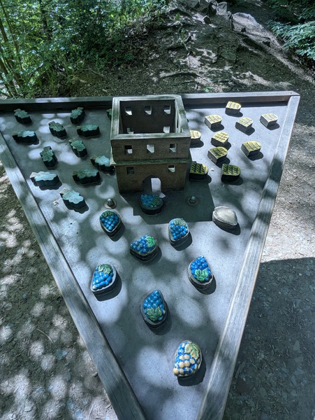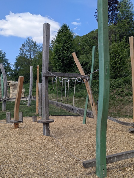Bemerkungen: Die Strecke ist nicht rollstuhl-geeignet. Es gibt folgende Schwierigkeiten: Bis zur Y-Burg geht es über Treppenstufen bergauf. Am Ende der Kugelbahn geht es ein kurzes Stück steil im Wald bergab.