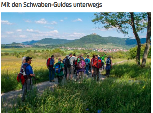 Ihr könnt mich auch als Schwaben-Guide buchen. Die Schwaben-Guides sind eine Gruppe von Wanderführern die Touren in ihrem Heimatgebiet anbieten. Das Angebot richtet sich an Ortsgruppen des Schwäbischen Albvereins aber auch an externe Gruppen bzw. Interessierte. Ihr findet mich in den Regionen "Filder, Schurwald, Remstal" und in "Schwäbisch-Fränkischer Wald". Die Buchung erfolgt entweder über die Ansprechpartner auf der Homepage des Schwäbischen Albvereins - bitte hier klicken oder direkt über den jeweiligen Wanderführer.